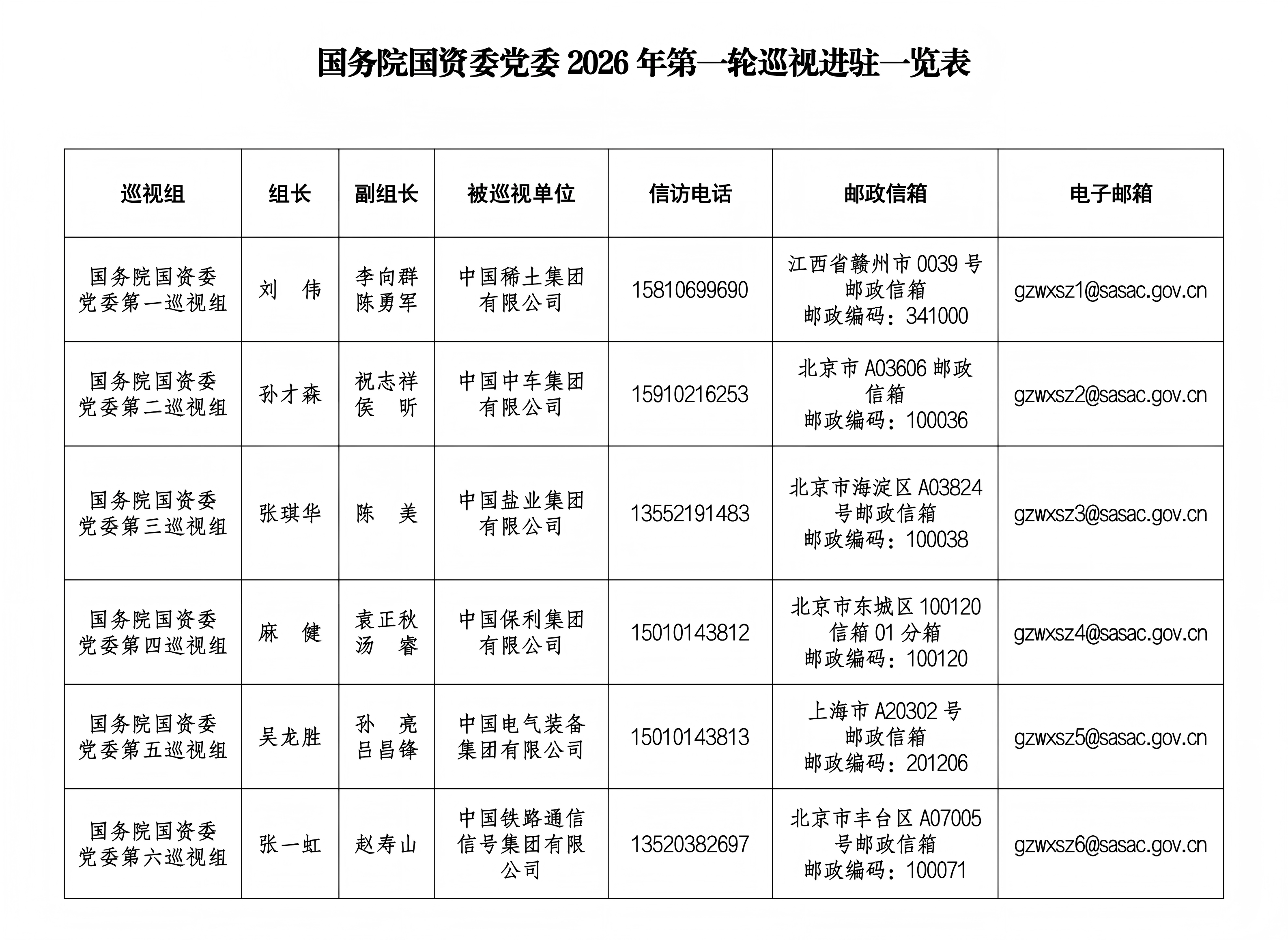 巡視期間,各巡視組設有專門值班電話、郵政信箱和電子郵箱,主要受理反映被巡視企業黨委領導班子及其成員、下一級主要負責人和重要崗位領導干部的來信來電來訪。巡視組受理信訪時間截止到2026年6月23日。
